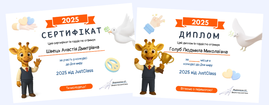 Платформа JustClass запрошує учнів та вчителів долучитися взяти участь у конкурсі до Дня миру, який відзначається 21 вересня 2025 р.