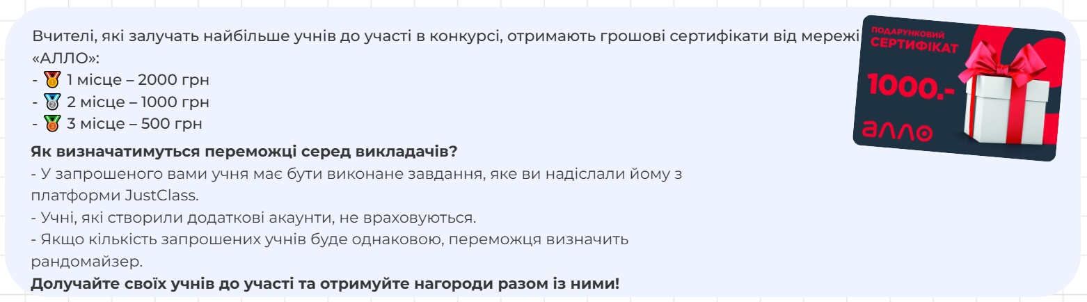 - В олімпіаді беруть участь тільки зареєстровані користувачі платформи JustClass.